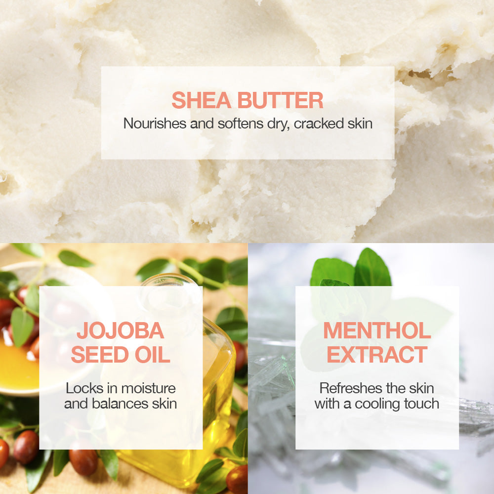 Water, Butylene glycol, Glycereth-26, Urea, Stearic acid, Isopropyl myristate, Butyrospermum Parkii(Shea) Butter, Glycerin, Cyclopentasiloxane, Cyclohexasiloxane, Simmondsia Chinensis (Jojoba) Seed Oil, Cetearyl Alcohol, Glyceryl Stearate, PEG-100 Stearate, Phenoxyethanol, Menthol, Allantoin, Panthenol, Ethylhexylglycerin, 1, 2-Hexanediol, Carbomer, Polysorbate 60, Prunus Avium (Sweet Cherry) Fruit Extract, Prunus Serrulata Flower Extract, Potassium hydroxide, Disodium EDTA, Fragrance